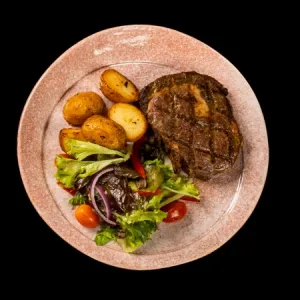 A 300gm juicy & tender cut of Angus ribeye steak, known for its rich marbling and intense beefy flavor. Served with Roasted Potatoes and Garden Salad.