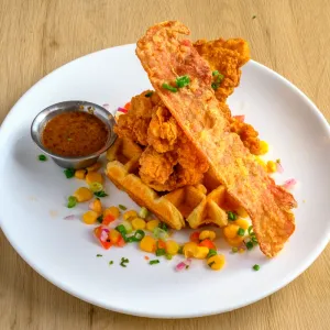 Southern-style fried chicken and waffles with tangy corn salsa, crispy bacon, and spicy mustard dressing on the side. A soulful and indulgent combination of flavors.