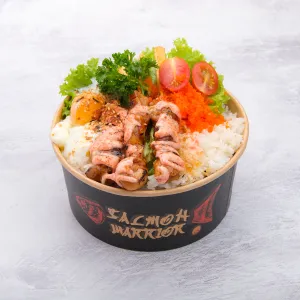Fresh salmon sashimi, onsen egg, cherry tomatoes, broccoli, onsen egg, cherry tomatoes, broccoli, corn, kizami nori. Udon tossed in light soya sauce.